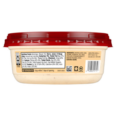 Snackers Classic Hummus with Pretzels - Sabra Pretzels (Enriched Wheat Flour [Wheat Flour, Niacin, Reduced Iron, Thiamine Mononitrate, Riboflavin, Folic Acid], Salt, Corn Oil, Sodium Bicarbonate, Malt Syrup). CONTAINS: WHEAT INGREDIENTS. Vegetarian Nutrition Information We know it's been tough to find some Sabra products in store lately! Sabra: Classic Hummus Nutrition Facts & Calories - Inlivo Contain a moderate amount of risky components that may include saturated fat and sodium (0.01%/oz). Good source of proteins (14% of DV/100g). Good source of fiber (28% of DV/100g). Calories in 1 2 Tbsp (1 oz) 69 calories / 44 from fat Carbohydrates 4 g Proteins 2 g Fat 4.9 g Saturated Fat 1 g Calories Nutrition Risky Content Medium Density Sabra Hummus Classic Allergy and Ingredient Information - Allergen Inside Nutrition Label Nutrition Facts Serving Size 28.00 g Servings Per Container 17.00 Amount Per Serving Calories 70 % Daily Value* Total Fat 5g 7.69% Saturated Fat 1g 5% Trans Fat 0g Cholesterol 0g 0% Sodium 0.13g 5.41% Total Carbohydrates 4g 1.33% Dietary Fiber 2g 8% Sugars 0g Protein 2g Vitamin A 0% Vitamin C 0% Calcium 2% Iron 4%