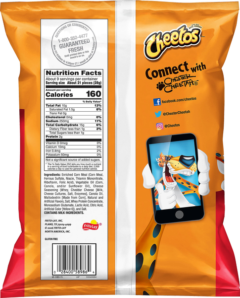 Cheetos ingredient label. Cheetos Crunchy Allergy and Ingredient Information Cheetos Crunchy Cheetos® crunchy cheese flavored snacks. Made with real cheese! guaranteed fresh until printed date., UPC Code 28400433181 Manufactured by Frito-Lay, Inc. ... THIS INGREDIENTS LABEL CONTAINS: 4 TOP 14 allergens. Cheetos Crunchy. Made By: Cheetos. SKU/UPC CODE: # 28400433181. PRODUCT DESCRIPTION: Cheetos® crunchy cheese ... Products | Cheetos Find your favorite CHEETOS® snacks and discover hot, spicy new flavors. Cheetos Nutrition Label - This Nutrition Cheetos Nutrition Label - This Nutrition Cheetos Nutrition Label Published on: 19/01/2021 | Last Updated: 07/04/2021 Learn more information about cheetos nutrition label. In this article we'll discuss cheetos nutrition label. This is not entire article. It continues ... KEEP READING... Sports Nutrition For Joints And Ligaments CHEETOS ® Simply Puffs White Cheddar Cheese Flavored Snacks Description These delicious snacks are baked to perfection and then seasoned using real cheese. CHEETOS ® Simply Puffs White Cheddar Cheese Flavored Snacks are made with no artificial flavors, preservatives, or colors. Nutrition Facts Ingredients Buy Now Buy Now CHEETOS® Simply Puffs White Cheddar Cheese Flavored Snacks (opens a popup)